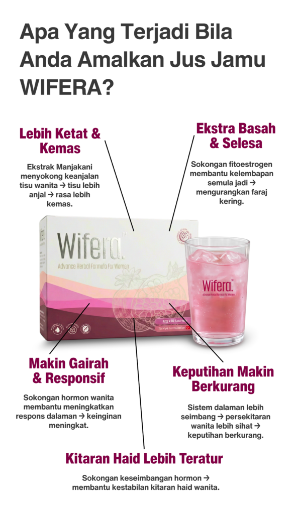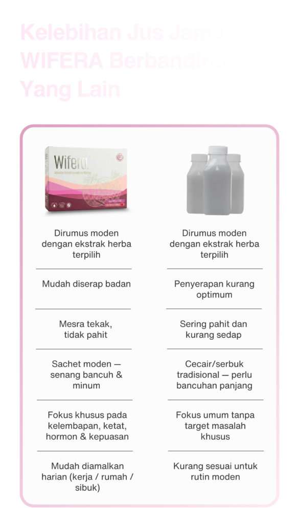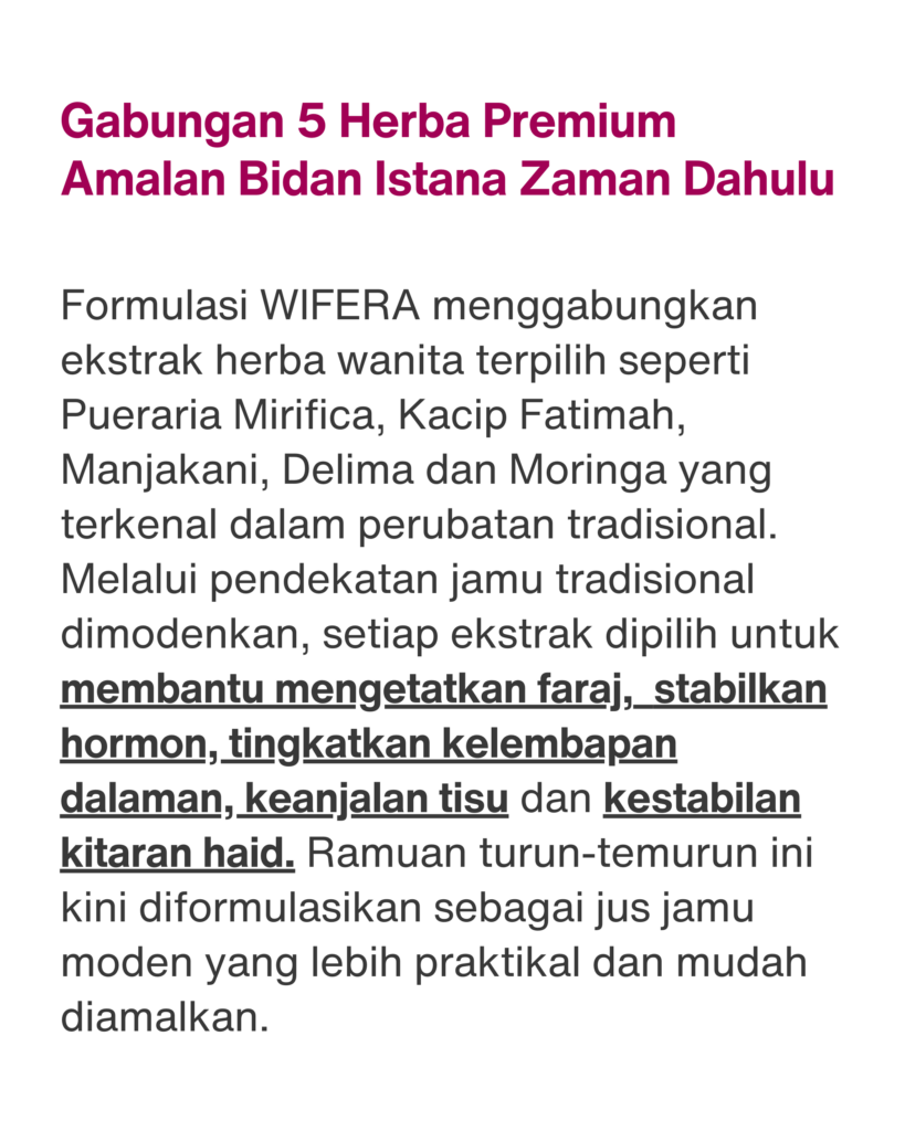WIFERA menggunakan gabungan ekstrak herba wanita yang digunakan secara tradisional dan diformulasikan untuk amalan harian yang lebih praktikal.